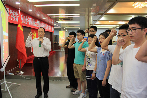 新党员面对鲜红的党旗,在所长助理薛冬峰的领誓下,举起右手庄严宣誓,为共产主义事业奋斗终身。