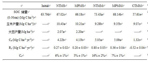 注:Initial:2001年;NTMS:免耕+玉米大豆轮作;MPMS:秋翻+玉米大豆轮作;NTMM:免耕+玉米连作;MPMM:秋翻+玉米连作;CTMM:传统性耕作;Ca:年均碳投入(Mg C ha-1 yr-1);SOC:土壤有机碳;Rc:SOC 储量变化速率(Mg C ha-1 yr-1);Cr:作物碳残留率。同一行相同小写字母表示无显著差异(P > 0.05)。