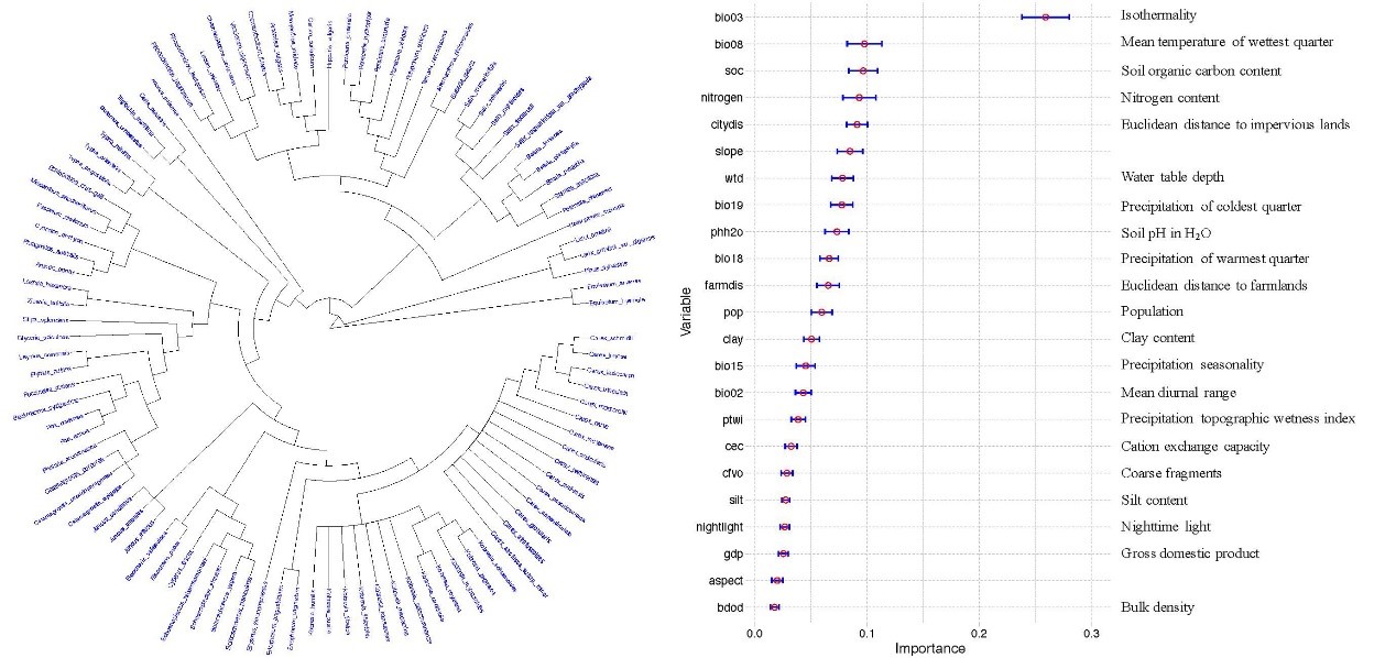 图1. 中国内陆沼泽湿地优势种发育关系及各环境因子重要性